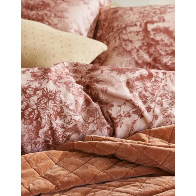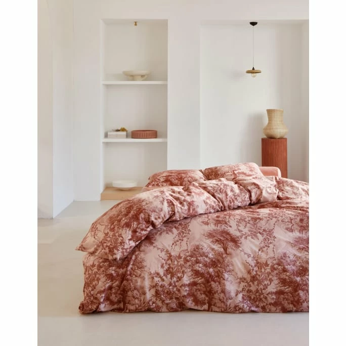 Eine Bettwäsche mit Geschichte! Über diese elegante Bettwäsche-Garnitur Aurelie von ESSENZA in harmonischer Farbgebung gibt es viel zu erzählen. Als Inspiration für dieses bildschöne Design diente der Toile de Jouy aus dem achtzehnten Jahrhundert. Dieser Stoff wurde von einem Textildrucker in der Nähe von Versailles mit romantischen Szenen des Landlebens, historischen Ereignissen oder biblischen Szenen, vorzugsweise in einer Farbe, bedruckt. Jetzt ist dieser schöne Druck mit einer modernen, einzigartigen Wendung zurück. ESSENZA entschied sich für Blumenmotive und raffinierte Illustrationen von Bäumen. Die Farbgebung macht es noch zeitgemäßer und verleiht dem Print einen frischen sowie femininen Touch. Die schlichte Rückseite präsentiert sich im Kontrast dazu im unifarbenen Design. Aus hochwertigem Baumwollsatin gefertigt und nach OEKO-TEX Standard 100 zertifiziert, ist das Set besonders glatt, atmungsaktiv und feuchtigkeitsregulierend. Es kann problemlos gereinigt und getrocknet werden. Die Bezüge verfügen zudem über einen praktischen Reißverschluss, wodurch ein bequemes Ab- und Beziehen garantiert ist. Überzeugen Sie sich selbst und erleben Sie höchsten Schlafkomfort mit der Satin Wendebettwäsche-Garnitur Aurelie von ESSENZA!