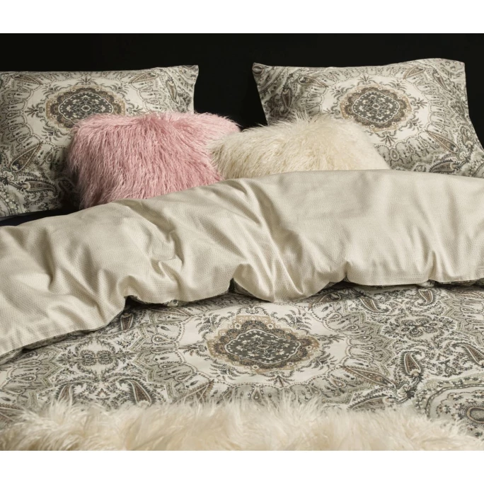 Die Lifestyle-Marke ESSENZA steht für Inspiration, Kreativität und Expressivität. Neueste Trends und Impulse fließen in die ESSENZA Kollektionen ein und werden dabei unnachahmlich inszeniert. Das Sortiment umfasst sowohl stylische Bettwäschen und Wohnaccessoires als auch Home- und Loungewear. Die faszinierende Bettwäsche-Garnitur Cadiz von Essenza im Wende-Look beeindruckt durch das orientalische Design und die hochwertige Qualität. Die Vorderseite ist mit edlen Ornamenten verziert. Die naturfarbene Rückseite ist mit einem feinem, dezenten Muster versehen. Die Bettwäsche besteht aus weichem und geschmeidigem Satin, welches aus 100% Baumwolle gefertigt ist. Zudem verfügen der Decken- und der Kissenbezug über einen Reißverschluss. Somit ist ein bequemes Ab- und Beziehen garantiert. Schaffen Sie mit der Bettwäsche-Garnitur Cadiz von Essenza im Wende-Look ein orientalisches Ambiente in Ihrem Schlafzimmer. Sie können diese exklusive Bettwäsche in verschiedenen Größen und Farben in unserem Shop erwerben.