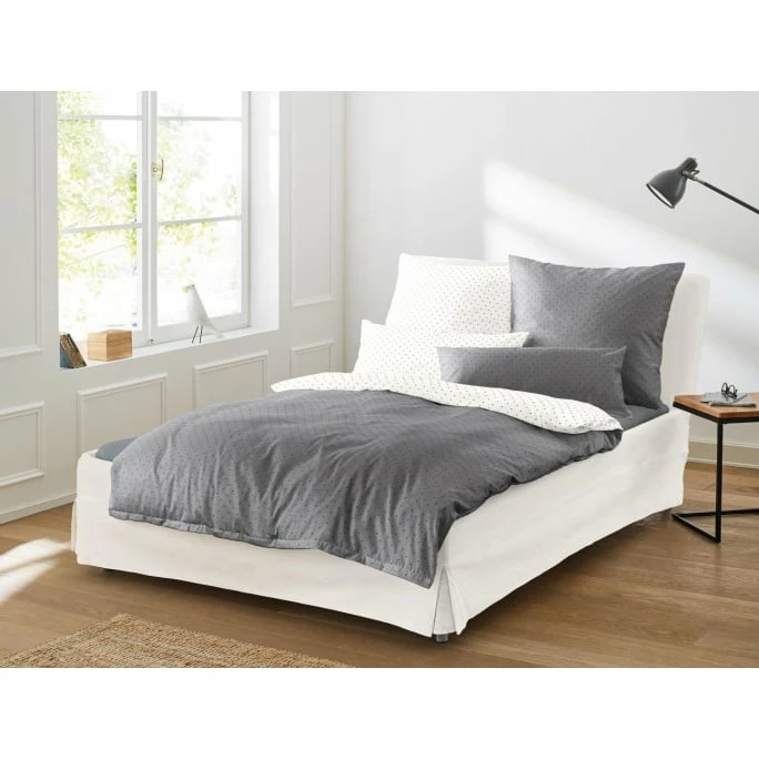 Kleine Tupfen – so weit das Auge reicht! Die wunderschöne Irisette Wende-Bettwäsche VARIA ist nicht nur von kleinen Punkten geprägt, sondern sie besticht ebenfalls durch einzigartige Eigenschaften und mit einer eleganten Optik! Angesichts ihres hochwertigen Herstellungsprozesses und der besonders feinfädigen Baumwolle weist sie ausgezeichnete klimatische Eigenschaften auf und eignet sich daher perfekt als Ganzjahresbettwäsche. Zudem verleiht diese Qualität, aufgrund des hautsympathischen Satin-Gewebes und der anspruchsvollen Bindungsart, ein sanftes und anschmiegsames Hautgefühl. Die in Deutschland hergestellte Qualitätsbettwäsche ist zudem äußerst bügelleicht, atmungsaktiv, temperaturausgleichend und problemlos für den Trockner geeignet. Des Weiteren erleichtert Ihnen ein verdeckter Qualitäts-Reißverschluss das schnelle Auf- und Abziehen der Wäsche. Ein echter Hingucker ist darüber hinaus das Kissen dieser Serie. Dieses zeichnet sich durch seine hochwertige Paspelkonfektion mit einem ganz besonderen Look aus. Die stilvollen Designs der Serie VARIA, verwandeln Ihr Schlafzimmer im Handumdrehen in Ihre ganz persönliche Wohlfühloase. Wie alle Irisette Textilien ist auch die Satin-Qualität aus hochwertigen Grundgeweben und ausschließlich nach dem Oeko-Tex-Standard 100 hergestellt und zertifiziert. Dieses Siegel sagt aus, dass der Artikel VARIA inklusive all seiner Bestandteile von dem unabhängigen Institut Hohenstein auf Schadstoffbelastung geprüft wurde. Genießen Sie Ihre wohlverdiente Bettruhe, mit der hochwertigen Bettwäsche VARIA von Irisette.