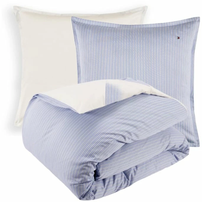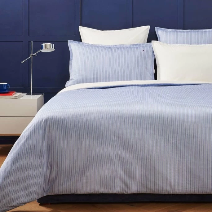Mit der schicken REFINED STRIPE Satin-Bettwäschegarnitur von Tommy Hilfiger bringen Sie eine moderne und zugleich klassische Optik in Ihren Schlafbereich. Aus reiner Baumwolle gefertigt, besticht das zart glänzende Satingewebe durch ein tolles Streifendessin. Der Wendelook, der kleine Stehsaum am Kissenbezug, die kleine Labelstickerei und die praktische Verschlussart runden das optische Gesamtbild dabei perfekt ab. Das Hilfiger Bettwäsche-Set besteht aus einem Bett- und einem Kopfkissenbezug und kann problemlos bei 60° in der Waschmaschine gereinigt und anschließend im Trockner getrocknet werden. Der hochwertige Baumwollsatin ist besonders weich, glatt, atmungsaktiv und feuchtigkeitsregulierend. Überzeugen Sie sich selbst und erleben höchsten Schlafkomfort mit der REFINED STRIPE Bettwäschegarnitur von Tommy Hilfiger!